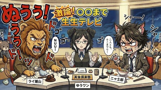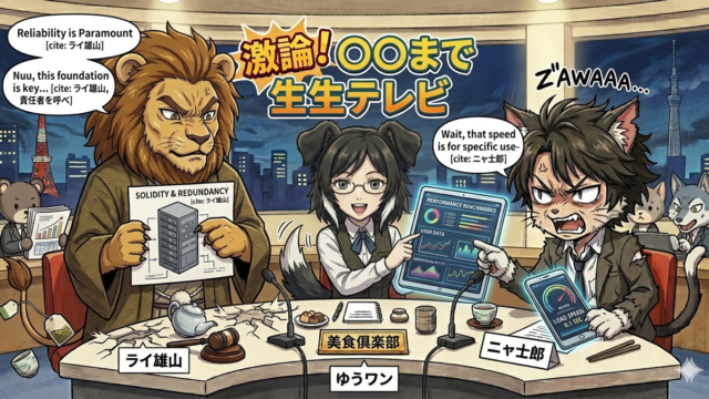 「パロディ」「ネタ」 激論!朝まで(?)アニマル美食討論会 ── 咆哮するライ雄山と冷笑するニャ士郎 知性派ボーダーコリーが胃を痛める 【読者の皆様へ:開会宣言】本プロジェクトは、2026年の過酷なブログ環境を生き抜くための「サーバー選び」を、某美食漫画へのリスペクトを込めてお送りするエンターテインメント比較記事です。ここから始まる「至高」と「究極」の対決、とくとご覧あれ。... 2026.02.27 「パロディ」「ネタ」サーバー選び