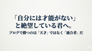 「自分には才能がない」と絶望している君へ。ブログで勝つのは「天才」ではなく「適合者」だ「毎日パソコンに向かっているのに、アクセスは一桁……」「隣のアイツは3ヶ月で収益化したのに、自分は半年経ってもゼロ……」そんな時、僕たちの頭をよぎるのは、...