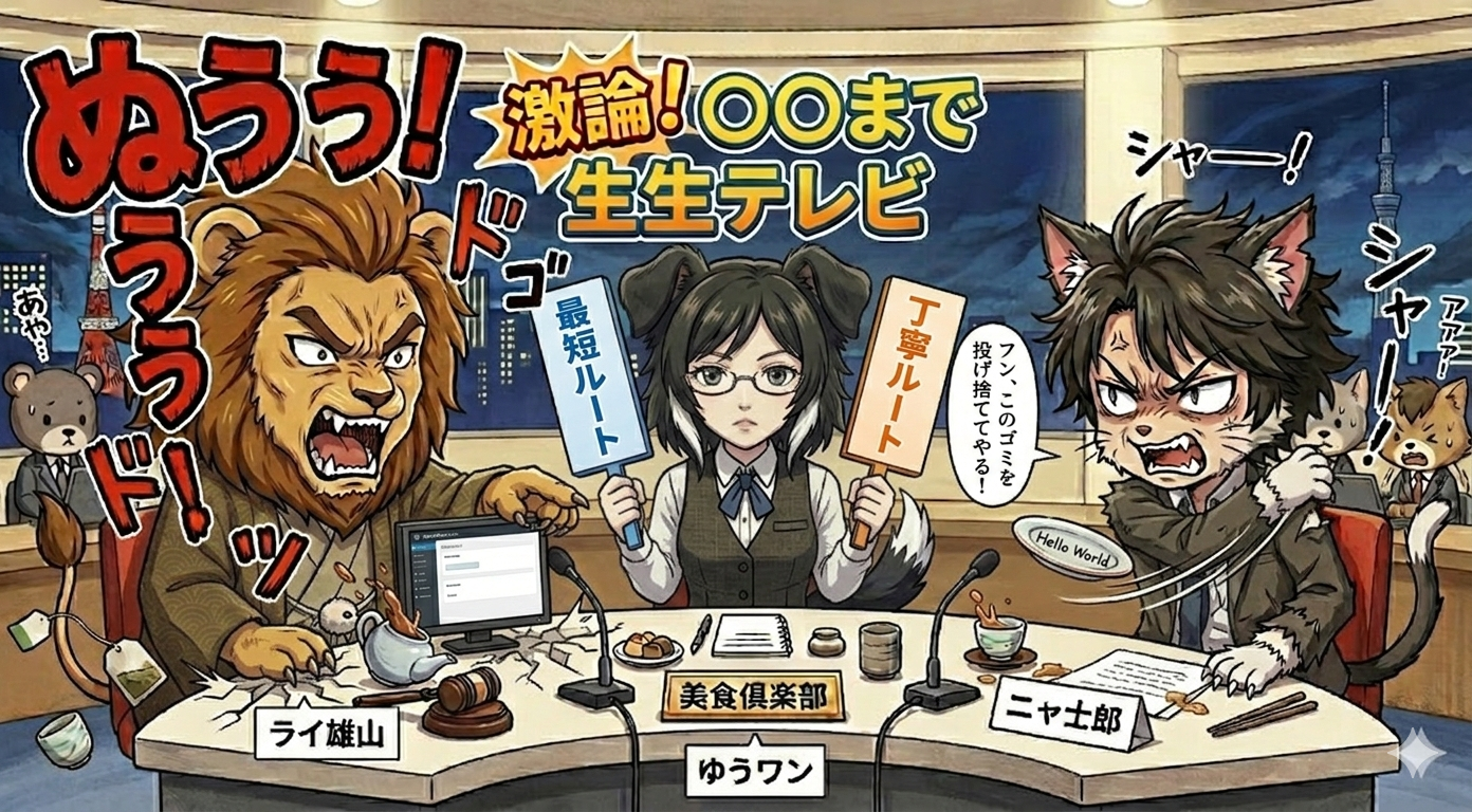 “へっ、ようやく準備体操が終わったってところだ。だがな、ここからが本当の地獄だぜ。どんなにいい厨房を揃えても、肝心の『記事』が不味けりゃ、客は二度と来ねえ。なぁ、ゆうワン、読者に最後のアドバイスをしてやれよ。”